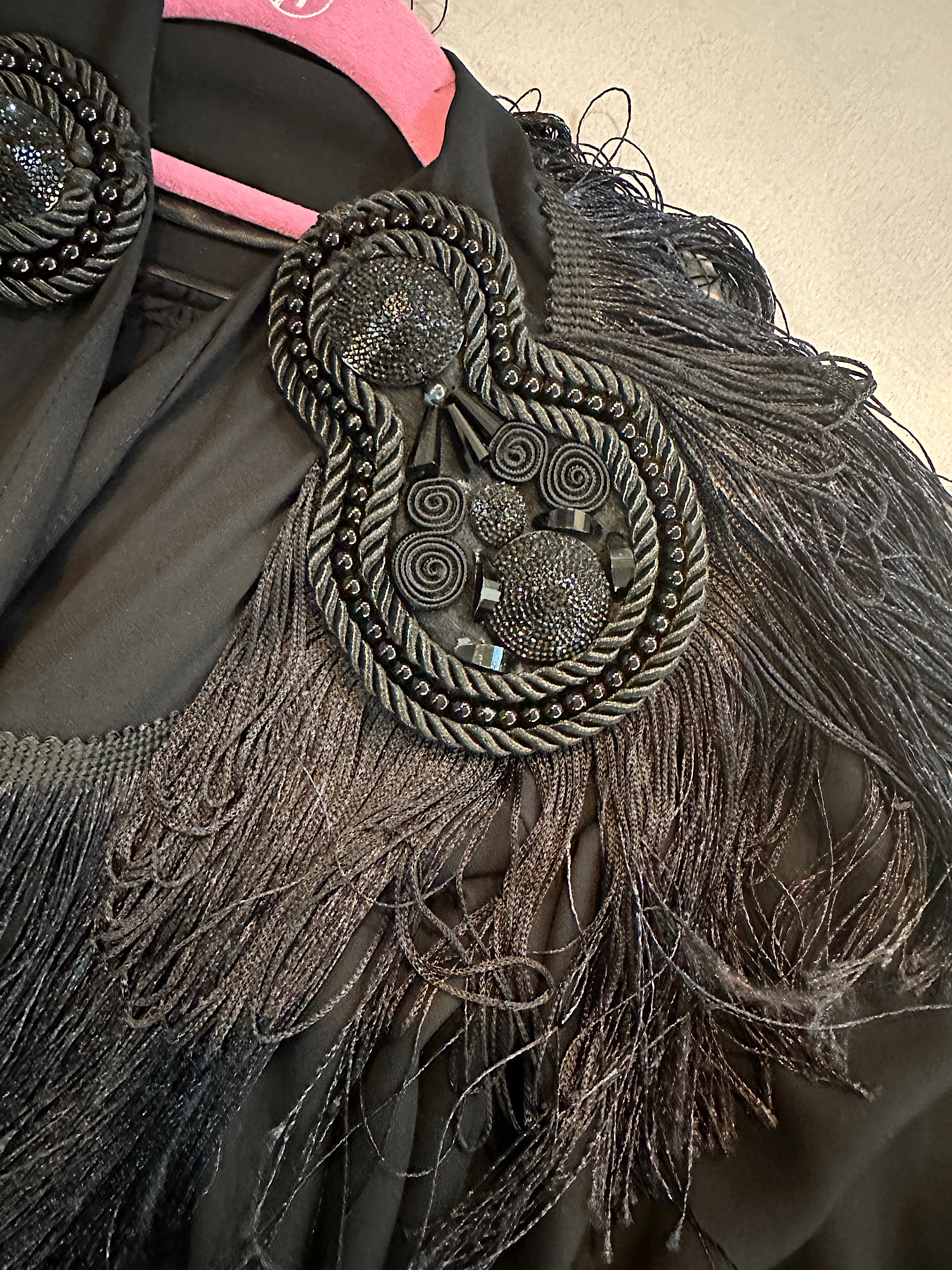 عبا کرپ حریر مشکی بدون آستین سرشانه ریش دار مناسب مجلس و روزمره